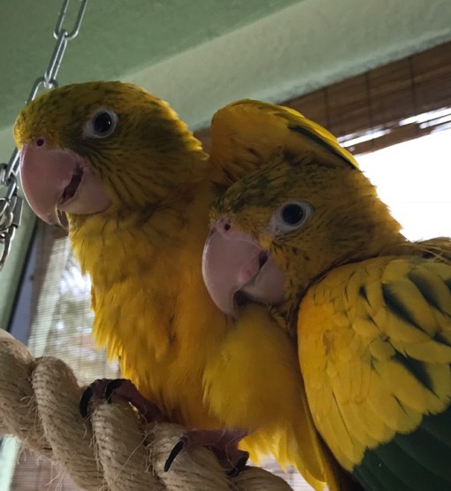 At hatch, Golden Parakeets are covered in white down that eventually turns darker within a week. By the end of the third week, wing feathers start to develop. Juveniles are playful clowns.